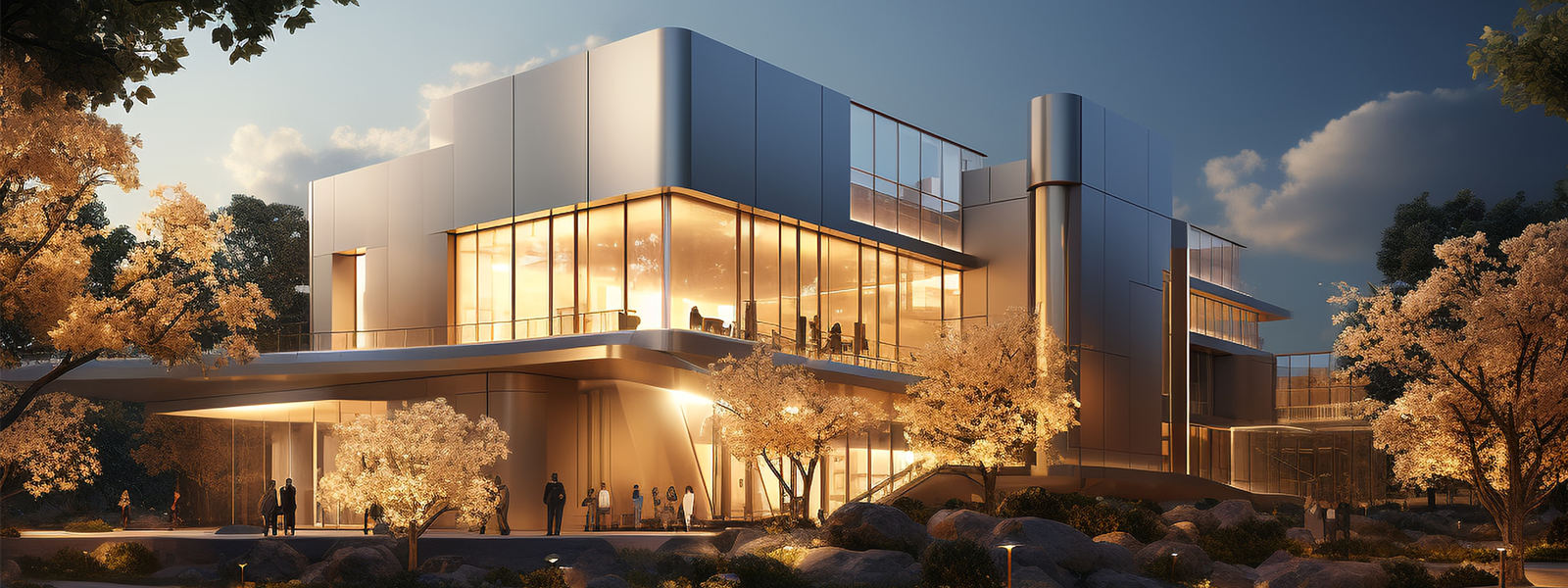 售樓中心樓體、售樓中心廣場(chǎng)、地面、水幕、水景、植被、雕塑、連廊、品牌標(biāo)志。