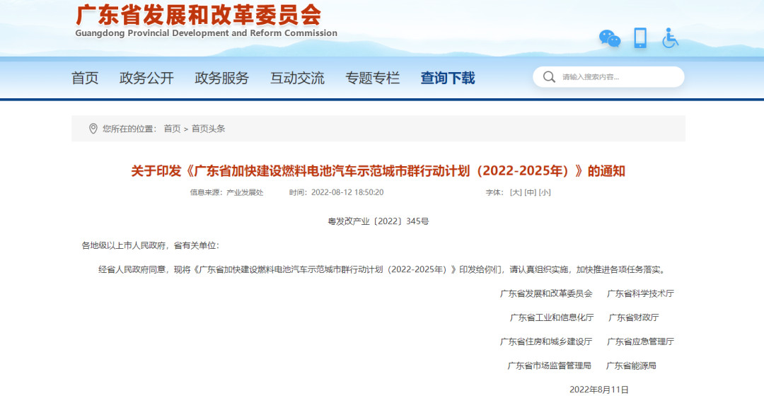 8月12日,廣東省發(fā)改委、科技廳、工信廳等八部門聯(lián)合印發(fā)《廣東省加快建設(shè)燃料電池汽車示范城市群行動(dòng)計(jì)劃(2022-2025年)》(下稱《行動(dòng)計(jì)劃》),為加快推動(dòng)廣東省燃料電池汽車示范城市群建設(shè),打造全國領(lǐng)先、世界一流的燃料電池汽車示范應(yīng)用區(qū)和技術(shù)創(chuàng)新高地提出了重點(diǎn)任務(wù)和保障措施。