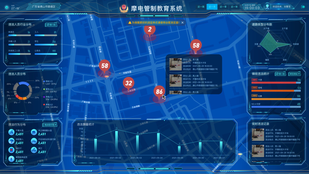 采用AI、大數(shù)據(jù)等技術(shù)結(jié)合具體業(yè)務(wù),為摩電治理工作順利開展提供線索。通過大量的違法行為數(shù)據(jù)和違法人員信息積累,進(jìn)行事故發(fā)生規(guī)律的推演,并逐步完善事故概率預(yù)測功能,為執(zhí)法和教育提供更好的參考依據(jù)。