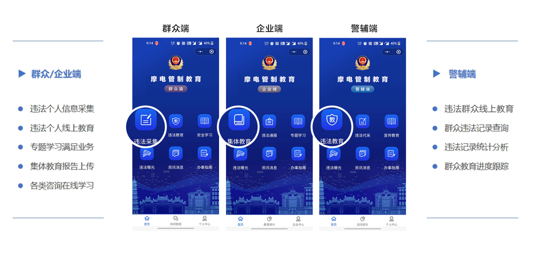 摩點“摩電”小程序可以根據(jù)不同用戶的登錄需求,設(shè)置了交警端、群眾端、企業(yè)端,實現(xiàn)交警、群眾、企業(yè)多元化聯(lián)動,實現(xiàn)信息化閉環(huán)管理。